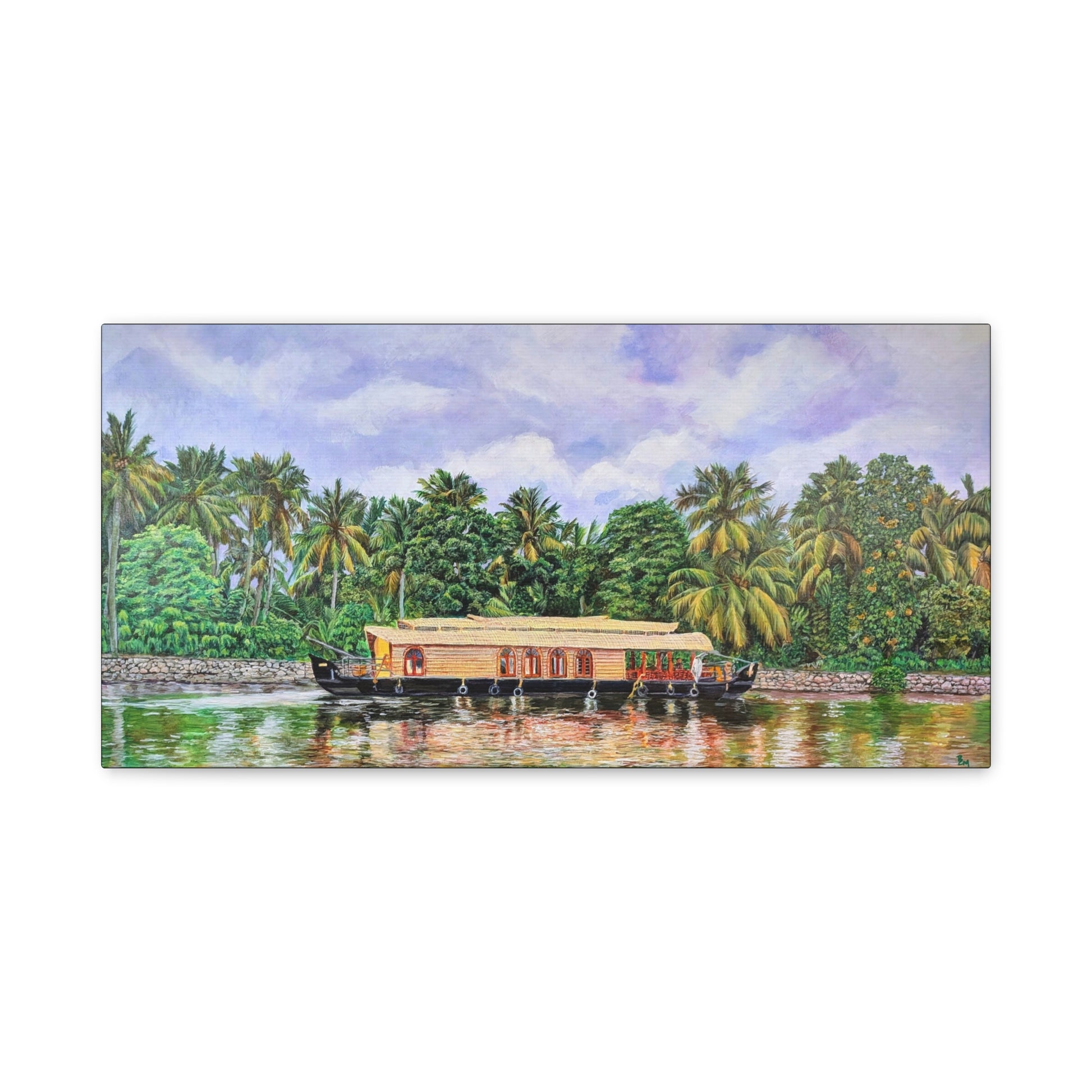 This stretched canvas print of the original painting "Kerala Houseboat: Tropical Backwaters" by Beena McMahan comes in 2 sizes and features the details of the original painting from the tropical foliage to the thatching of the houseboat to the reflections in the water. This peaceful scenery will transport you to the serenity of Kerala, India, also known as "God's Own Country."